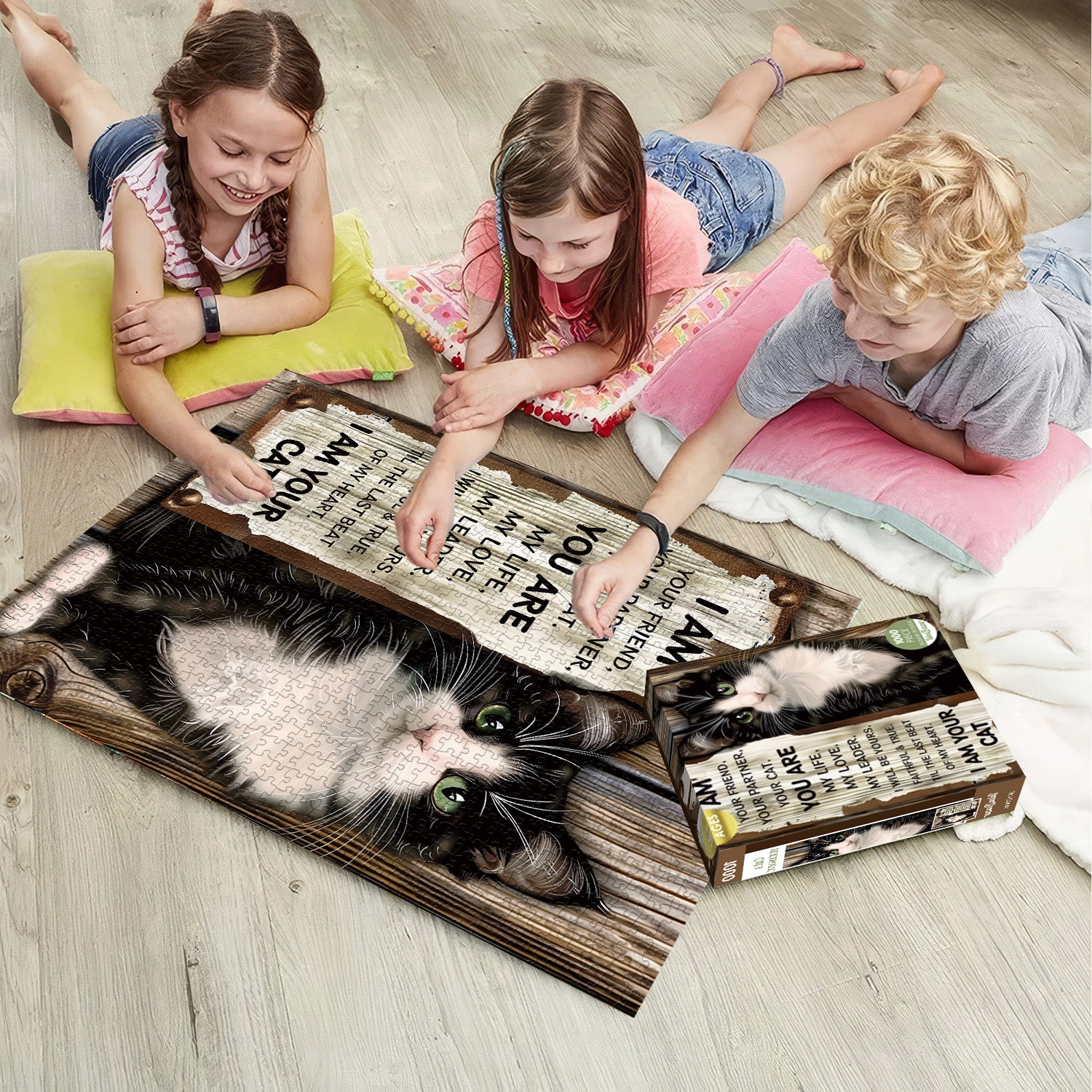 🧩Exquisite Workmenship: 1000 piece jigsaw puzzle cat is printed on three layers of thick white cardboard, precision cutting and clear printing, features vivid color and smooth surface, also has the letters on the back, will help you complete the puzzle.