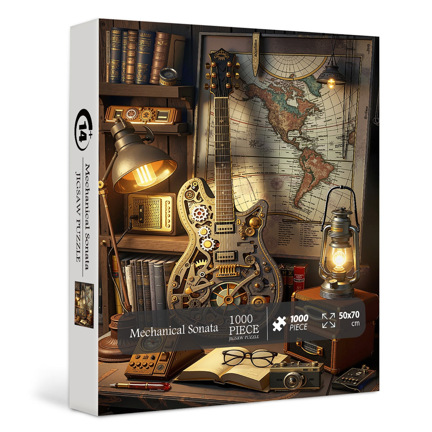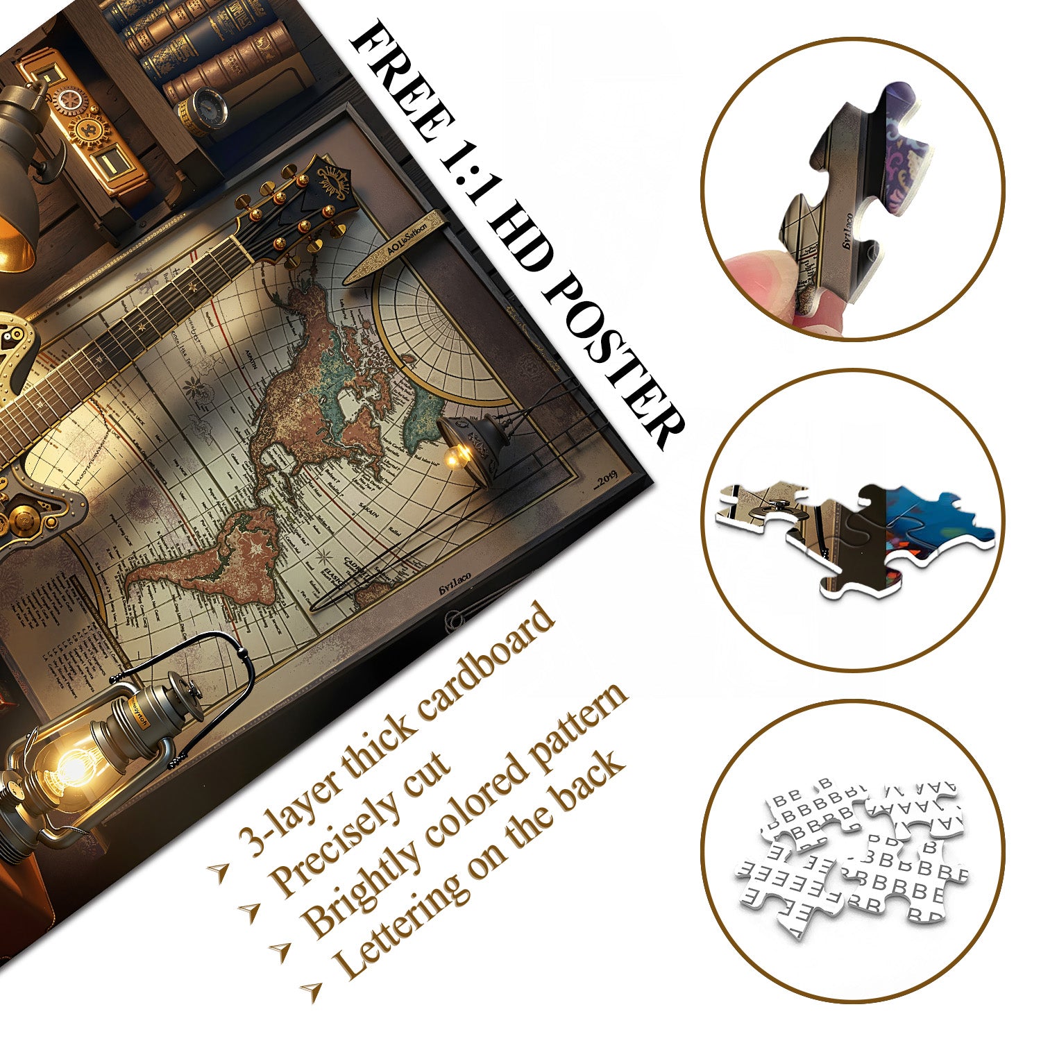 ⚙️Mechanical Sonata Jigsaw Puzzle: 🎸A geared guitar gleams with a metallic shimmer, a vintage map holds untold journeys, and a kerosene lamp and old books interweave to create the romance of the industrial age. 🎵This is a fantastical scene that blends mechanical aesthetics, musical fervor, and the spirit of adventure. It's as if you can hear the symphony of churning gears and twanging guitar strings.