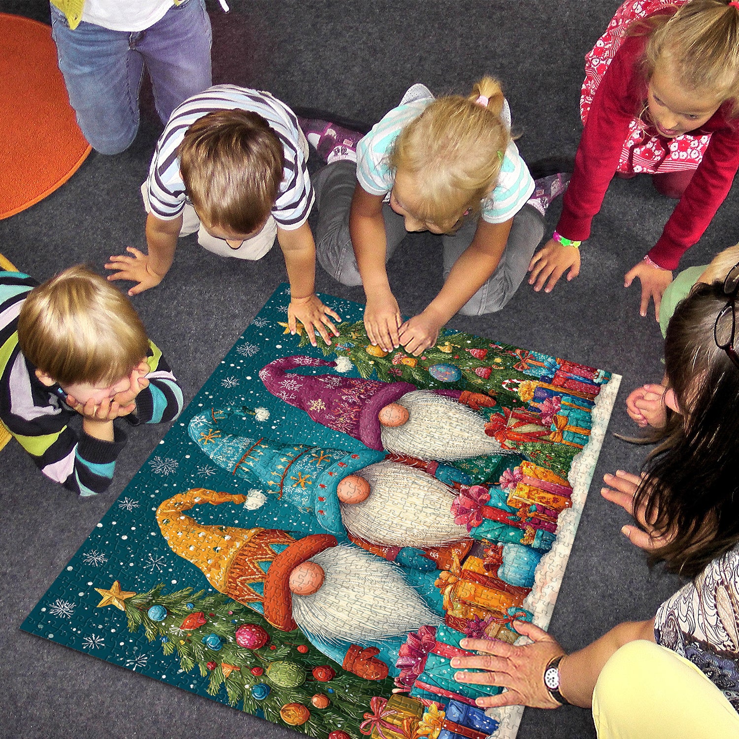 🧙✨Jolly Snow Gnome Jigsaw Puzzle: The puzzle features three Santa Clauses wearing different colored hats standing in front of a Christmas tree, each laden with gifts, creating a festive atmosphere. The Santas are surrounded by gifts of various colors and shapes, symbolizing the generosity and joy of Christmas.