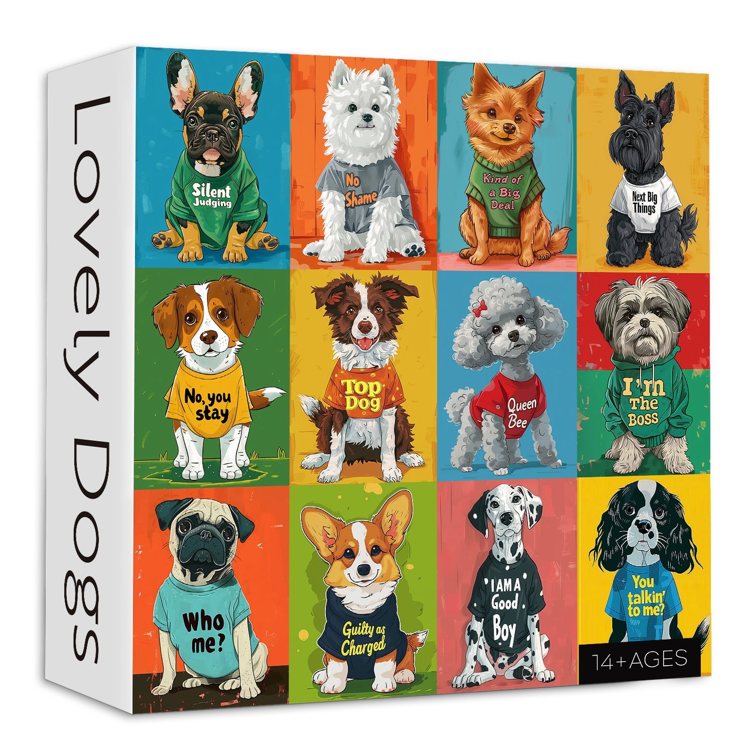 Lovely Dogs Jigsaw Puzzle 1000 Pieces: The picture shows 12 dogs of different breeds, colours and looks, each showing their unique charms and personalities, wearing distinctive t-shirts and conveying funny messages. Whether you're a dog lover or a casual viewer, these dogs are sure to endear themselves to you.