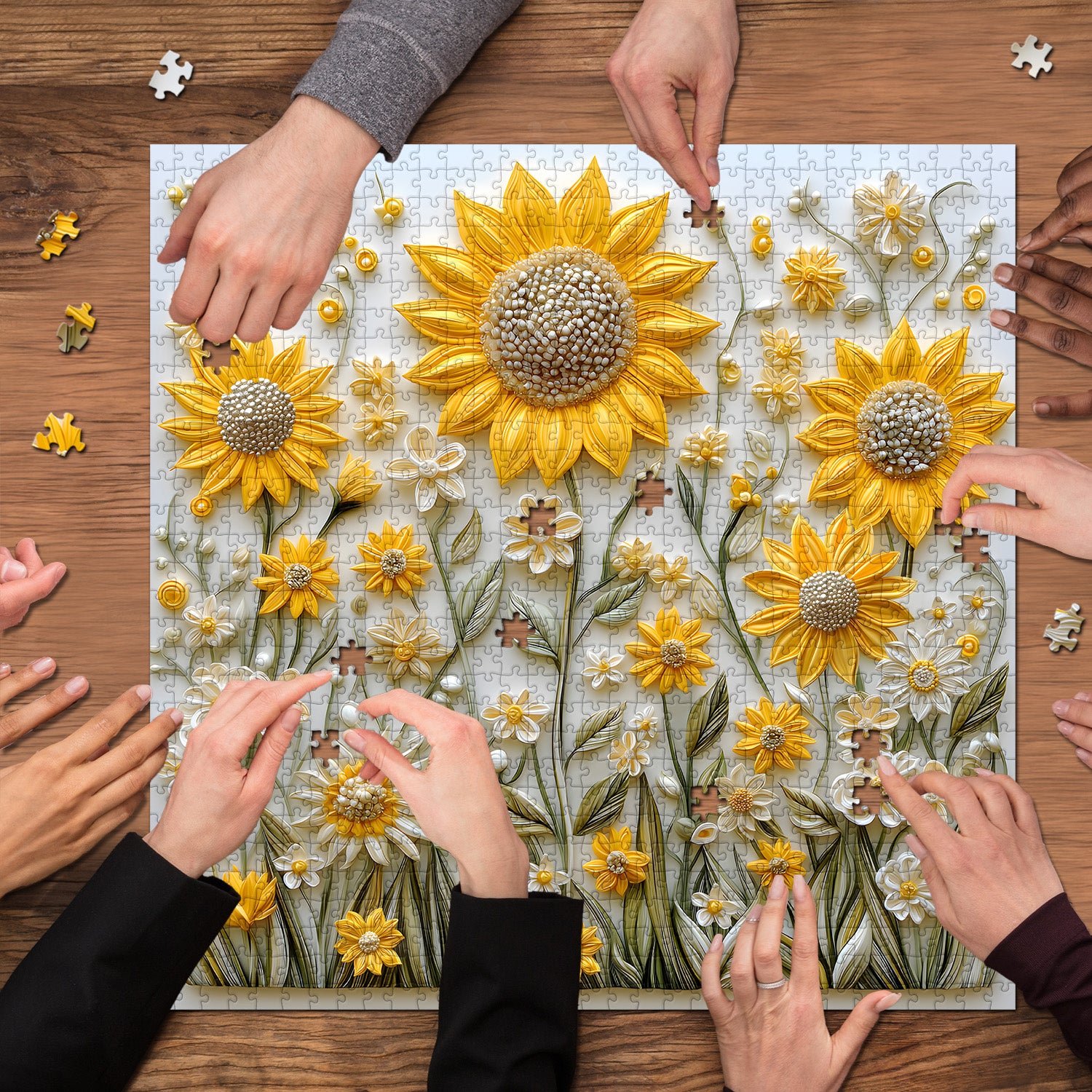 【Golden Sunflower】This jigsaw puzzle captures the moment of sunflowers and daisies blooming in the sun, and each piece of the puzzle is full of vitality and vigor. From the golden yellow of sunflowers to the pure white of daisies, the puzzle presents a vivid picture of nature with rich colors. They are an ode to nature, singing the beauty and tenacity of life.