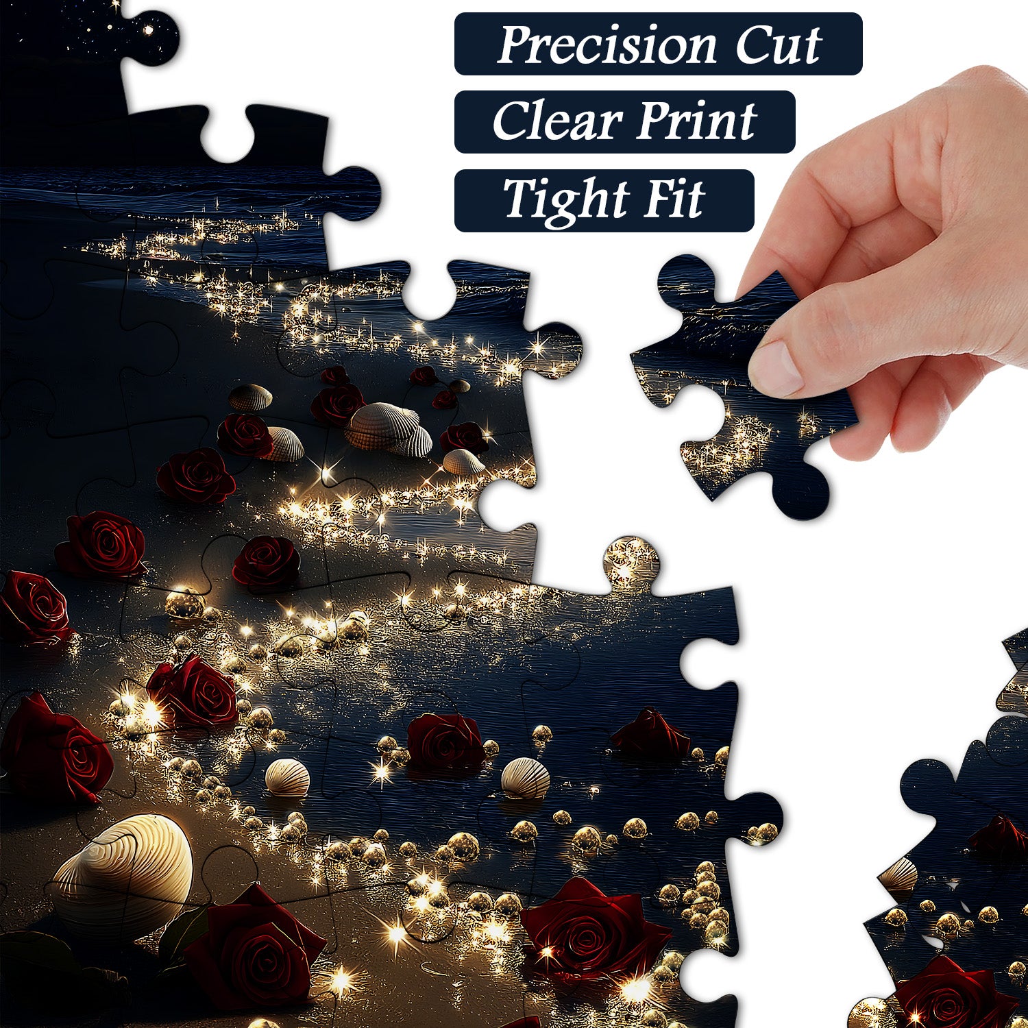 Sea of Roses: The puzzle is set against the backdrop of a quiet night by the sea, with a crescent moon hanging high in the sky, casting gentle moonlight. Red rose petals and white shells are scattered on the water, as if they were treasures from the sea. Starlight is jumping on the water, creating a dreamy and romantic atmosphere.