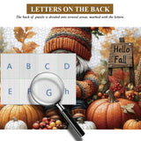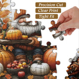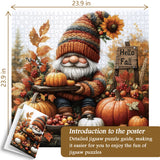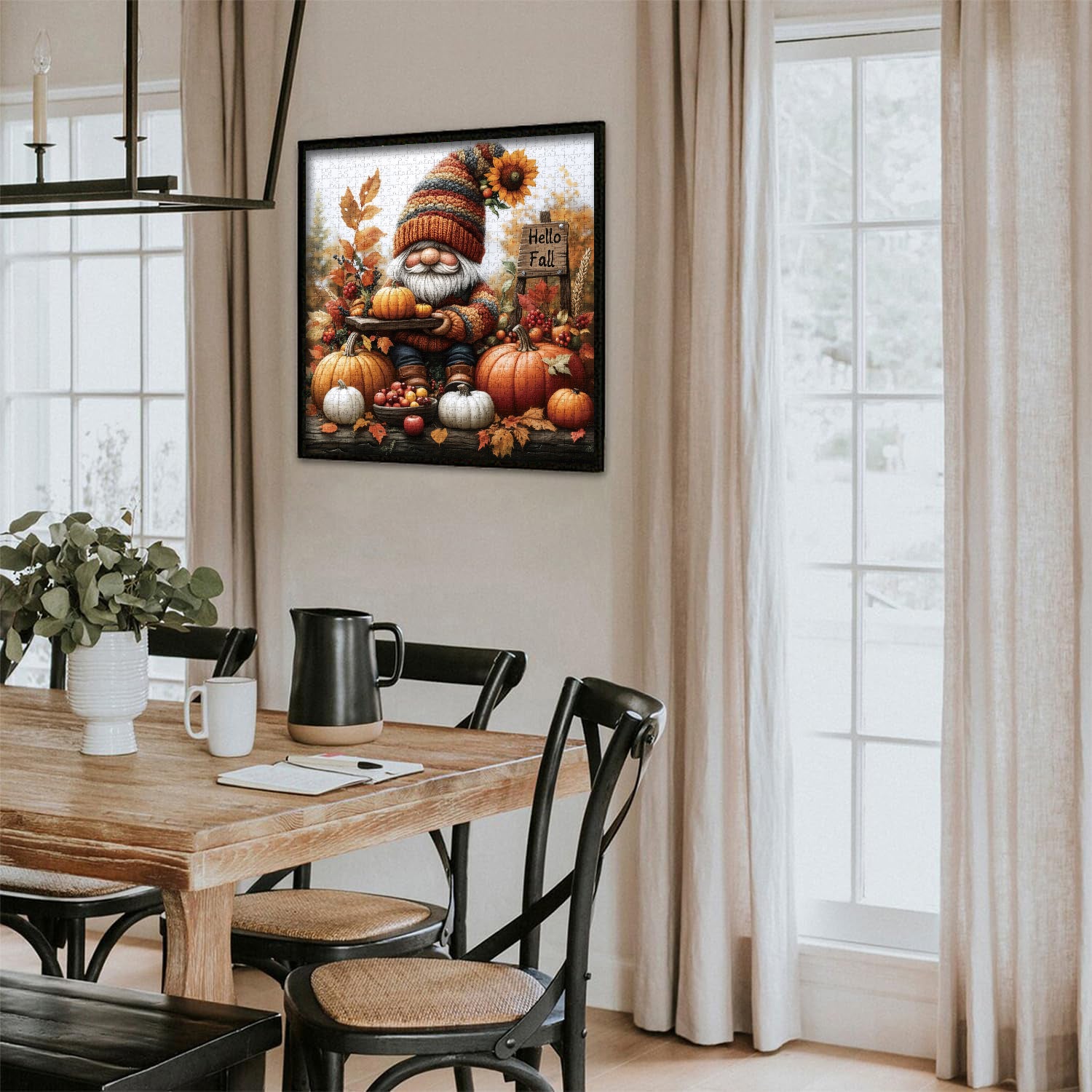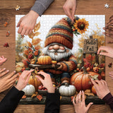 Gnome Harvest Jigsaw Puzzle: An old man wearing a knitted hat and smiling is sitting in a pile of pumpkins. His image reminds people of the harvest and warmth of autumn. Pumpkins of various sizes and colors are placed around, and the wooden sign next to it reads "Hello Fall", as if greeting everyone who sees it, welcome to this beautiful season.