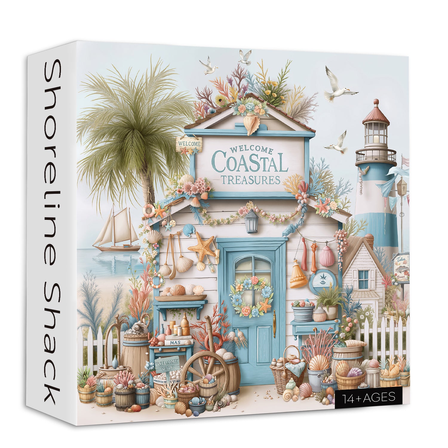 🧩1000-PIECE PREMIUM QUALITY: The hard fine art jigsaw puzzles are made of recyclable three-layer cardboard and preciely cut for a snug fit. The shoreline shack puzzle 1000 pieces painting features high resolution, matte finish and smooth edging.