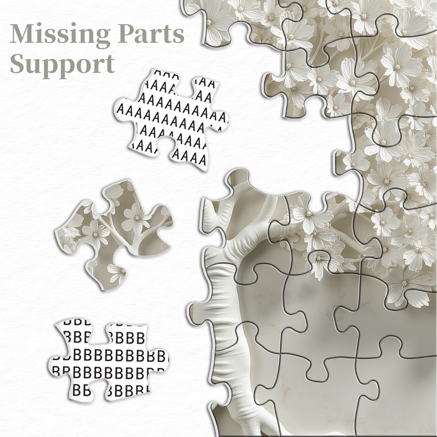 2️⃣ Stunning 3D Embossed Effect: Each detail appears hand-sculpted, with layered petals and textured bark that create a lifelike three-dimensional look. The pure white tones reflect light softly, giving this puzzle a refined and artistic glow.