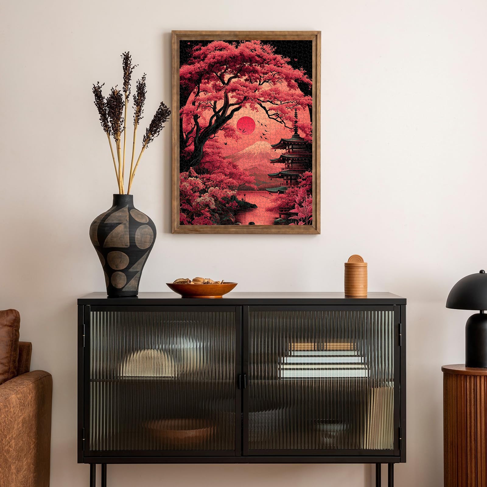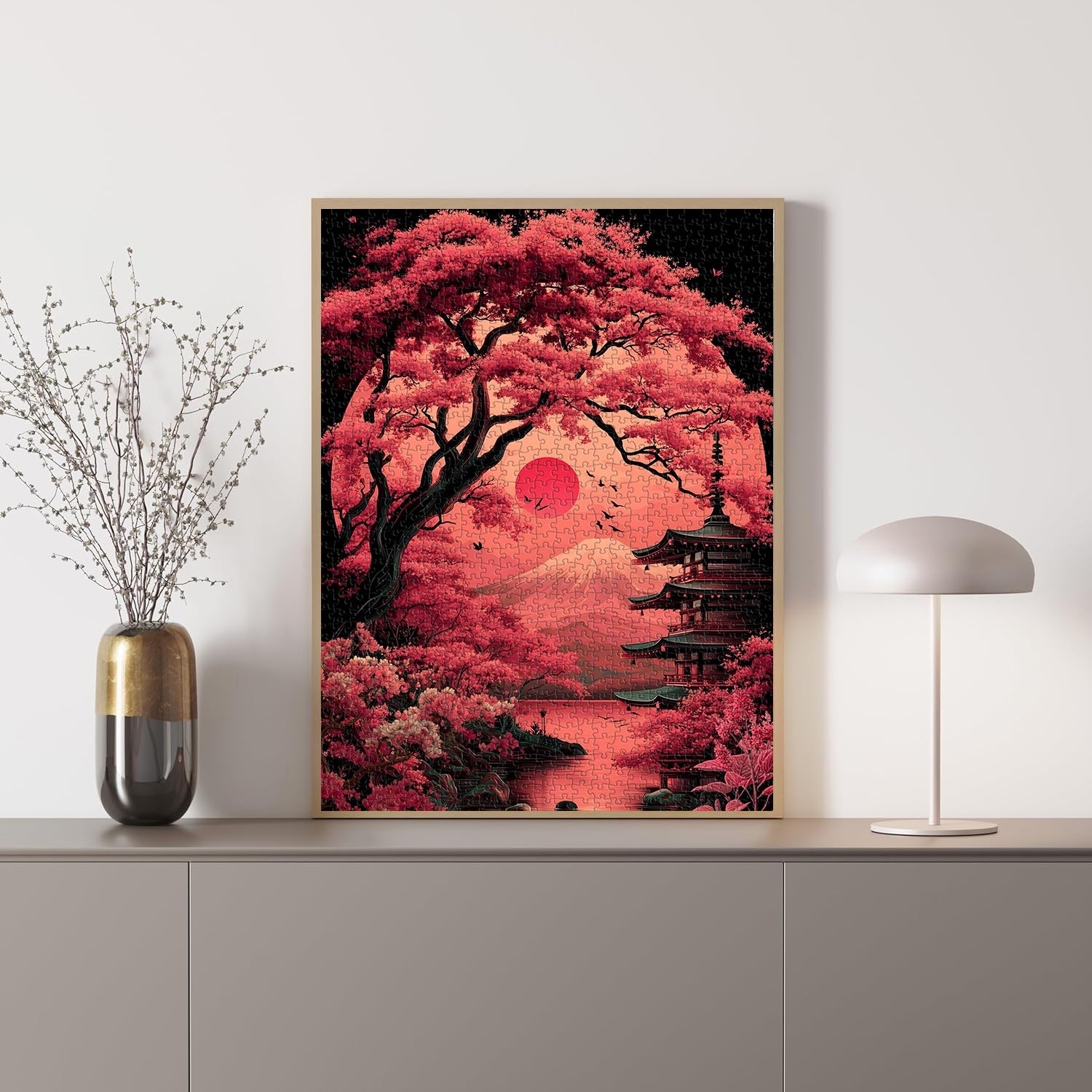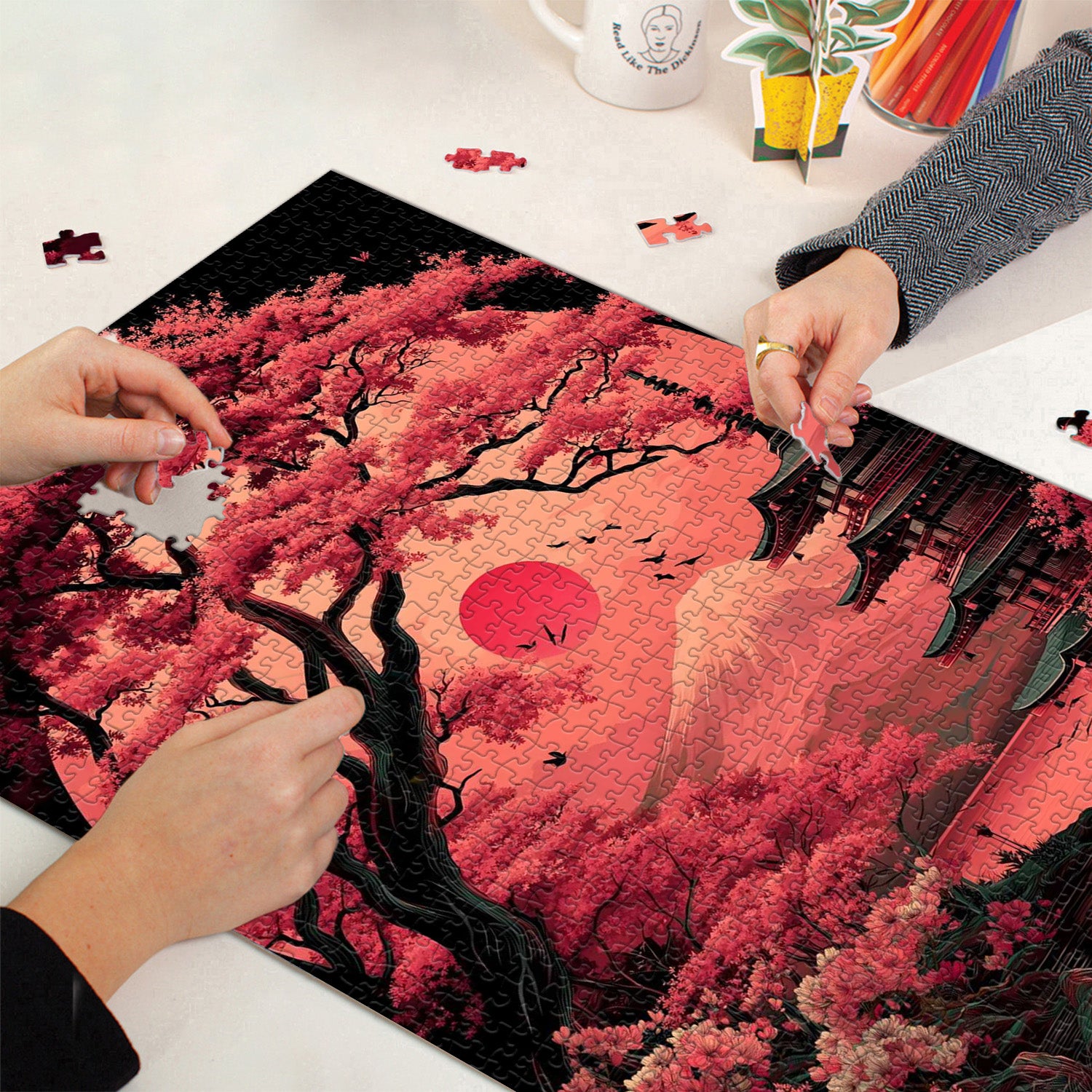 Finshed Size: 27.6*19.7in/(70*50cm). Jigsaw puzzles 1000 pieces comes with exquisite box and high-resolution poster. This poster is a reference to the puzzle on the front and an introduction to the Twilight Cherry Blossoms on the back.