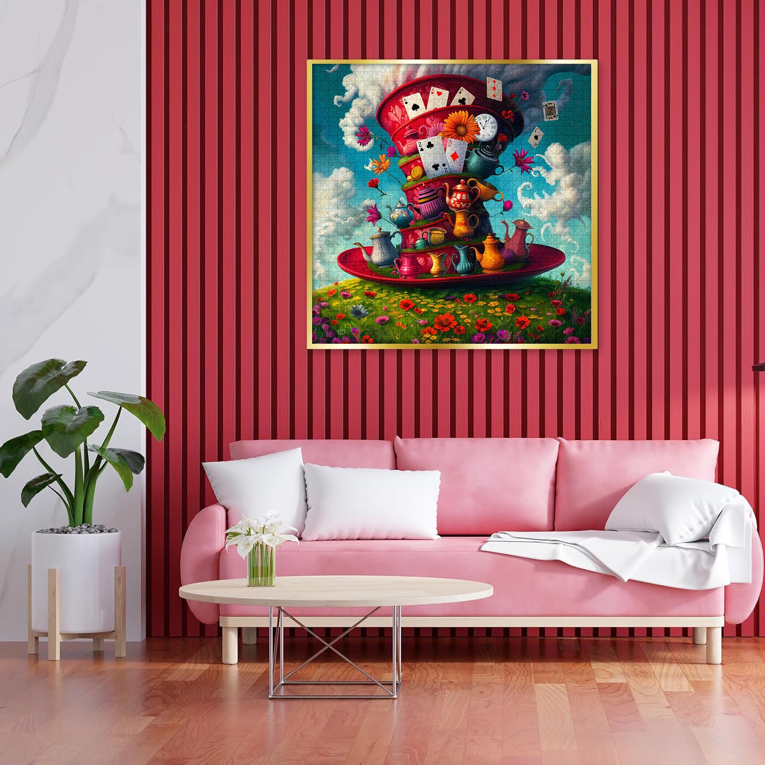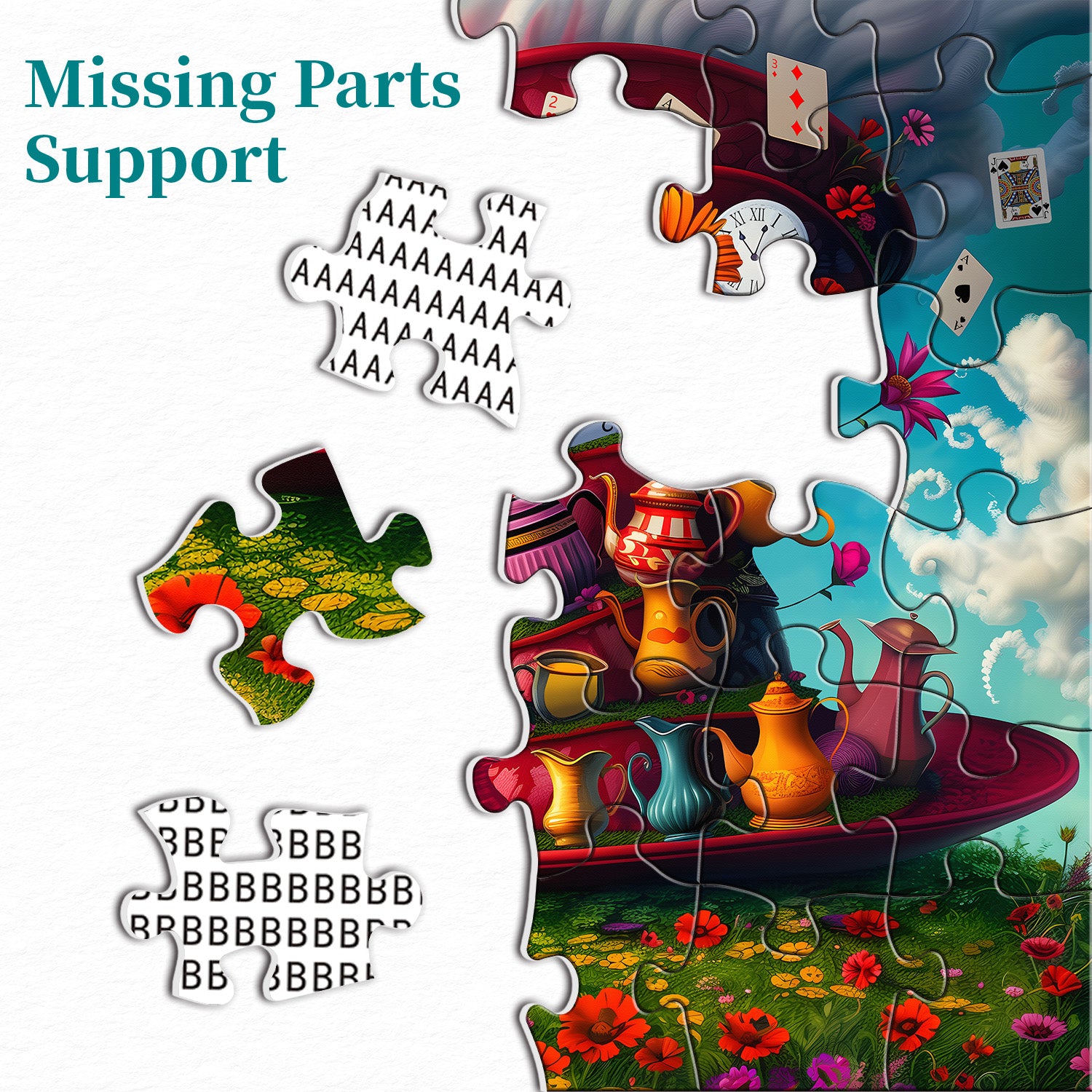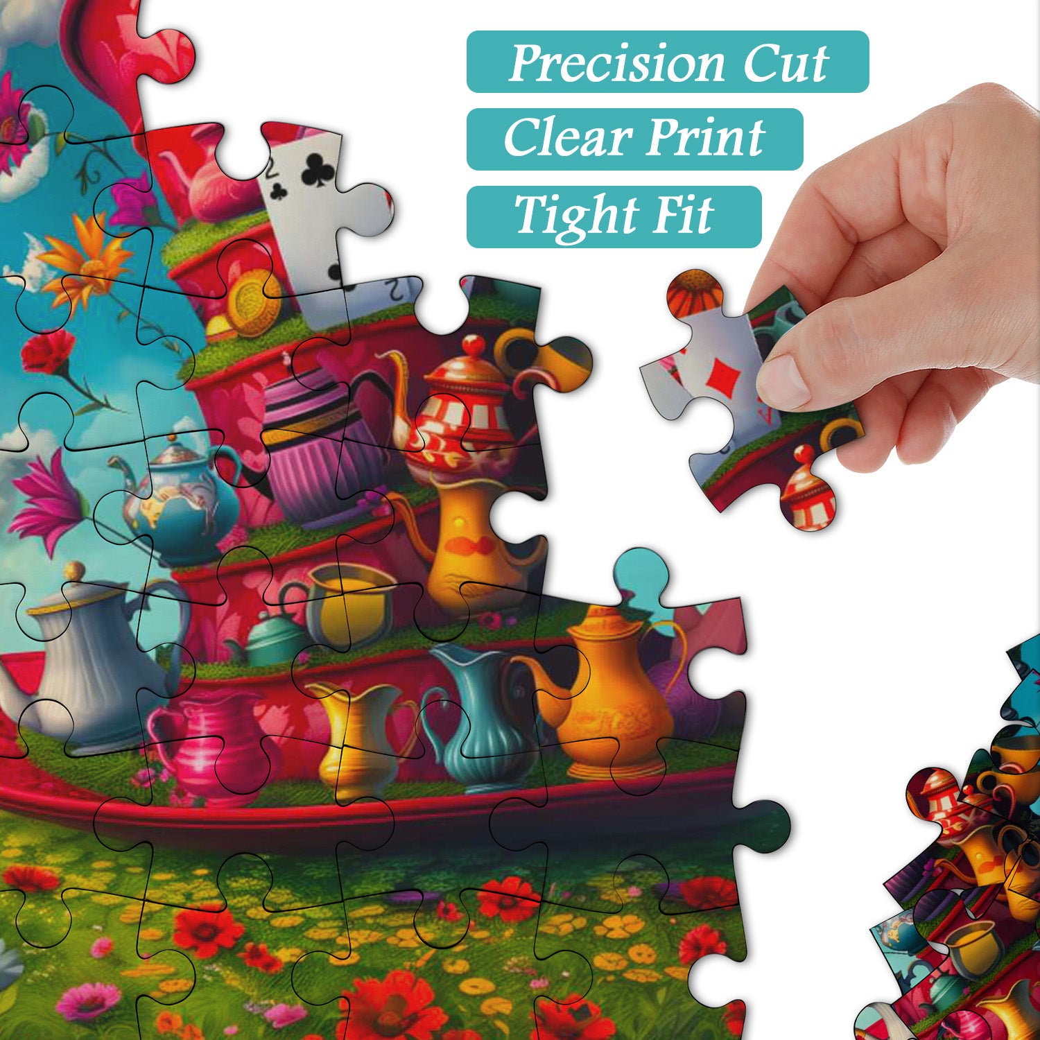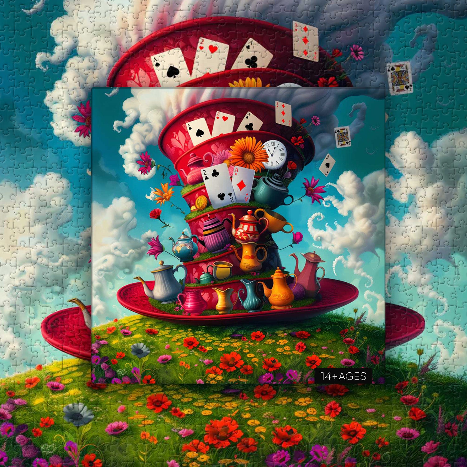 Magic Card Hat Jigsaw Puzzle: When playing cards dance in the wind, the clock freezes at the magic moment, colorful teapots and flowers are stacked on the giant hat... This Magic Card Hat 1000-piece puzzle is like a combination of fairy tales and dreams, taking you into a fantasy magical world.
