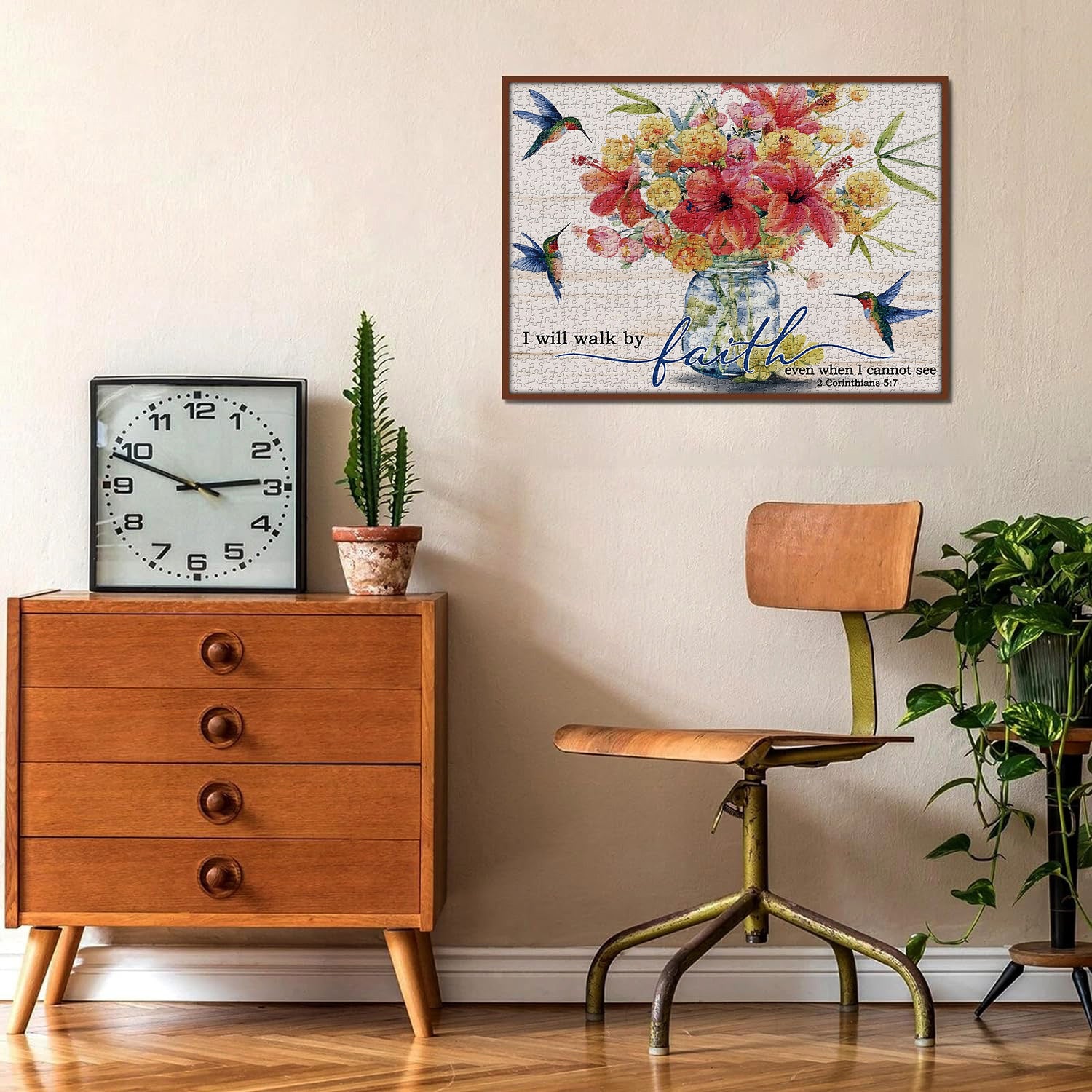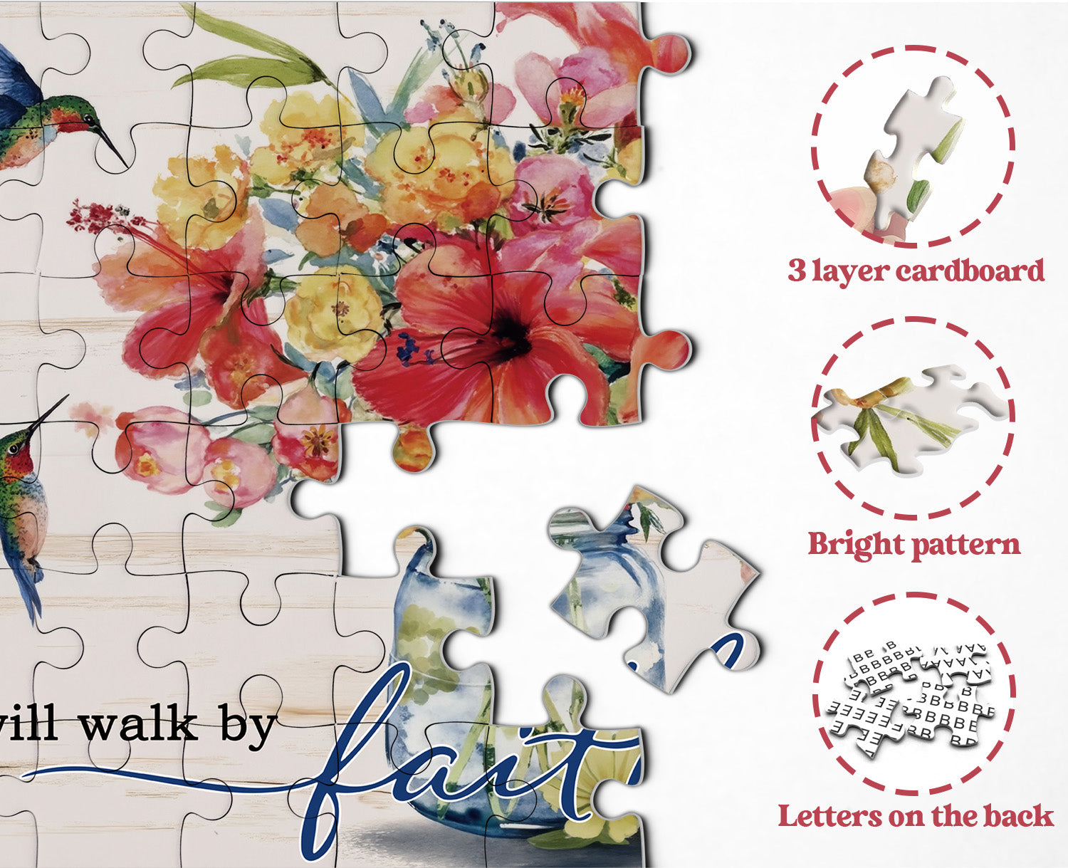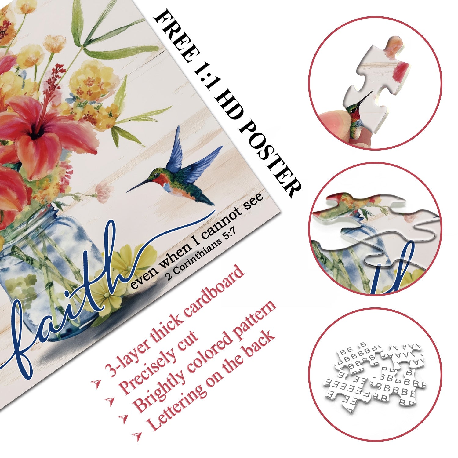 🐦💐Path of Faith: This puzzle presents a soothing watercolor still life—a clear glass jar holds vibrant red hibiscus and gentle yellow roses, with three hummingbirds perched atop it, their wings shimmering like jewels. The background features a light wood grain, interspersed with the handwritten scripture "I will walk by faith even when I cannot see." The assembly process is like a meditation, and the completed piece is a work of art that brings peace and strength.🌺✝️