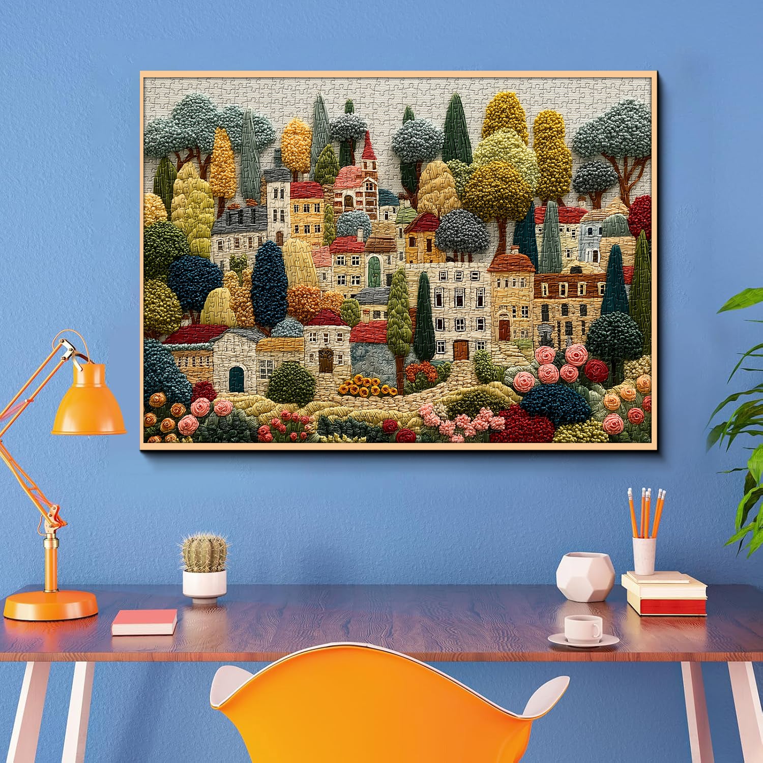 🎨🧶【Embroidery Village】This puzzle is inspired by the art of hand-embroidery, with each piece creating a three-dimensional visual effect of linear texture. A closer look reveals the fluffy texture of the trees, the layered rooftops, and the knitted texture of the flowers, each one like a story woven stitch by stitch. The completed town's colors are soft yet rich, like a tranquil poem on an autumn afternoon, a sight to behold.